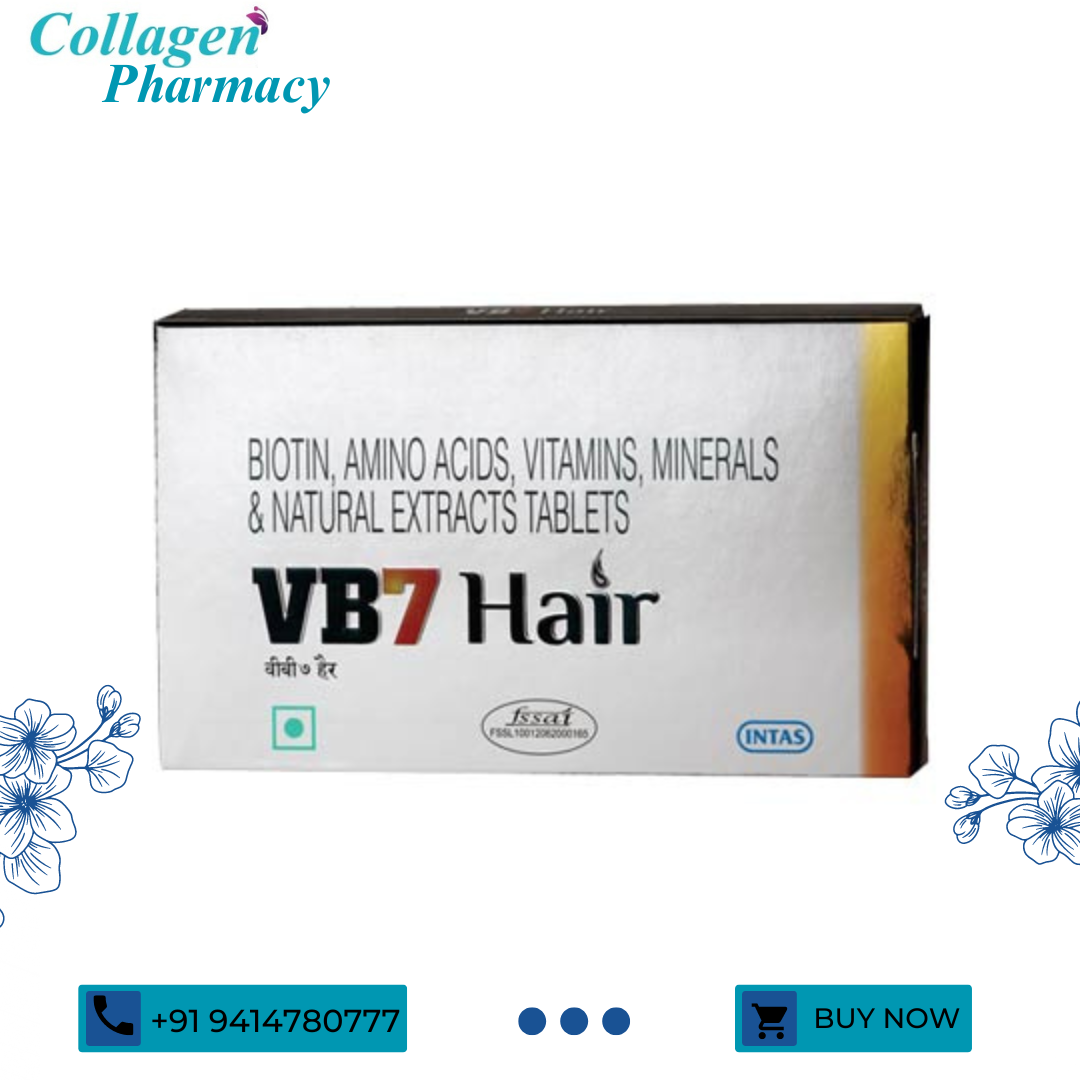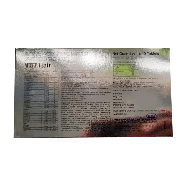 VB7 Hair Tablet is a nutritional supplement used to stimulate the growth of new and existing hair, minimize hair fall, provide nutrient-rich blood supply to hair and scalp, reverse graying of hair, and nutrify the hair follicle from within.
